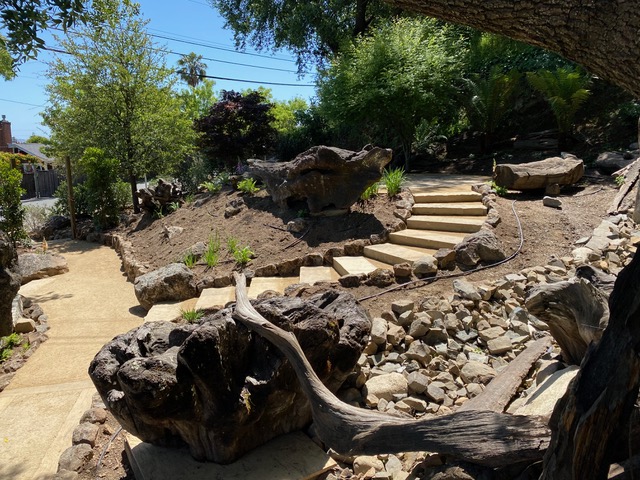 Practicing Sustainability The fact that GraniteCrete can be recycled also fits Washer’s overall landscaping approach. While it’s not explicitly stated, it’s clear that sustainability is important to him, illustrated by items scattered throughout that he’s given a second life: We traversed a pathway paved with unused headstones, admired “sculptures” crafted from naturally-fallen and harvested redwood trees, and visited another garden that uses San Francisco cobblestones as edging.